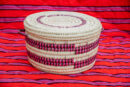 This beautiful cylindrical basket is purpose-built to hold and present serving dishes, functioning as a stylish casserole or serving bowl cozy. It features a tight coiled weave with contrasting horizontal stripes of Pink & Dark Brown thread.