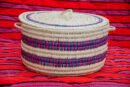 This beautiful cylindrical basket is purpose-built to hold and present serving dishes, functioning as a stylish casserole or serving bowl cozy. It features a tight coiled weave with contrasting horizontal stripes of Pink & Purple thread.